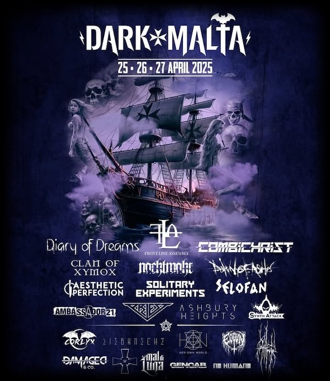 Dark Malta Festival… An exceptional line-up for the sixth year of this dark celebration with some oldschool established names on the goth/industrial/metal scene and a few new and upcoming bands/artists from around the world… From Canada’s industrial pioneers Front Line Assembly to L.A’s Dawn Of Ashes, from Sweden’s Ashbury Heights and Priest to Austria’s Nachtmahr, from Germany’s Diary Of Dreams to U.K’s Corlyx, from Holland’s iconic dark wavers Clan Of Xymox to U.S’s Aesthetic Perfection and Combichrist (just to name a few)… Plenty of highlights again this year with Italy’s Mal Di Luna, the opening act for Dark Malta this year, performing for the second time at this festival… A very theatrical and atmospheric performance in a vampiric mode… Selofan from Athens Greece gave an outstanding performance with their catchy dark beats and tunes… Their version of Grace Jones’s ‘I’ve Seen That Face Before’ was one of the hightlights of the band’s show by far along with their classic ‘Billy Was A Vampire’…